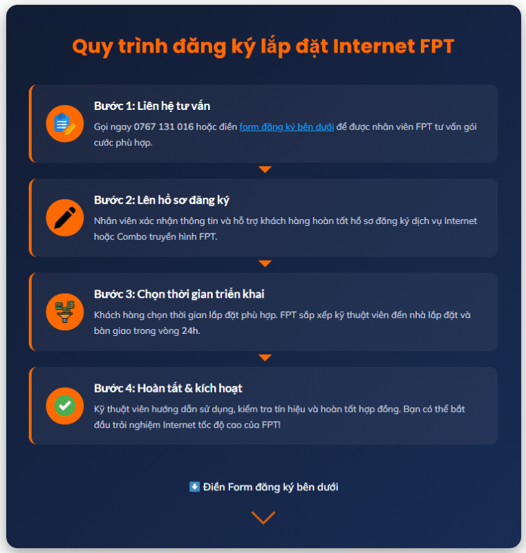 Để lắp đặt mạng FPT, khách hàng chỉ cần để lại thông tin liên hệ. Nhân viên FPT sẽ gọi tư vấn miễn phí, hỗ trợ chọn gói phù hợp và tiến hành lắp đặt tận nơi.