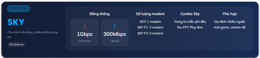 - Sky (1Gbps): Phù hợp hộ gia đình đông thành viên, học tập & làm việc online.