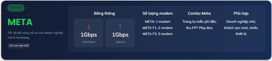 - Meta (1Gbps): Tốc độ cao cấp, tối ưu cho chơi game, xem phim 4K, livestream.