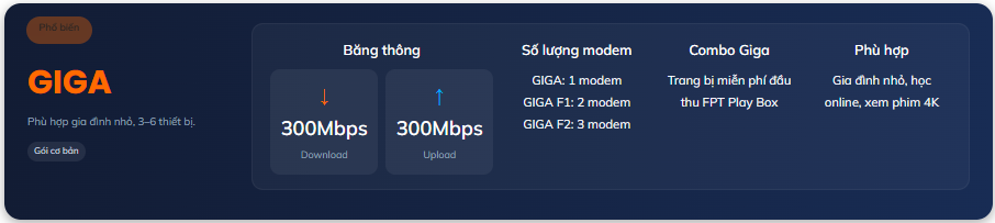 - Giga (300Mbps): Dành cho gia đình nhỏ, nhu cầu cơ bản.