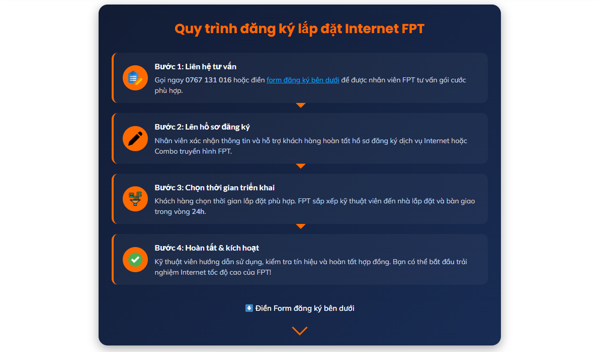 Để lắp đặt mạng FPT, khách hàng chỉ cần để lại thông tin liên hệ. Nhân viên FPT sẽ gọi tư vấn miễn phí, hỗ trợ chọn gói phù hợp và tiến hành lắp đặt tận nơi.